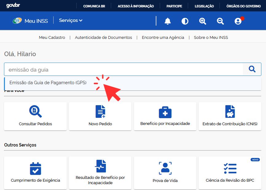 Após fazer login, você será direcionado para a página inicial do Meu INSS, então Pesquise na barra de busca por “Emitir Guia de Pagamento (GPS)” e depois clique na opção: