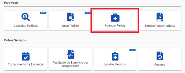 - Logo na primeira página, no menu principal, clique na opção “Agendar Perícia“: